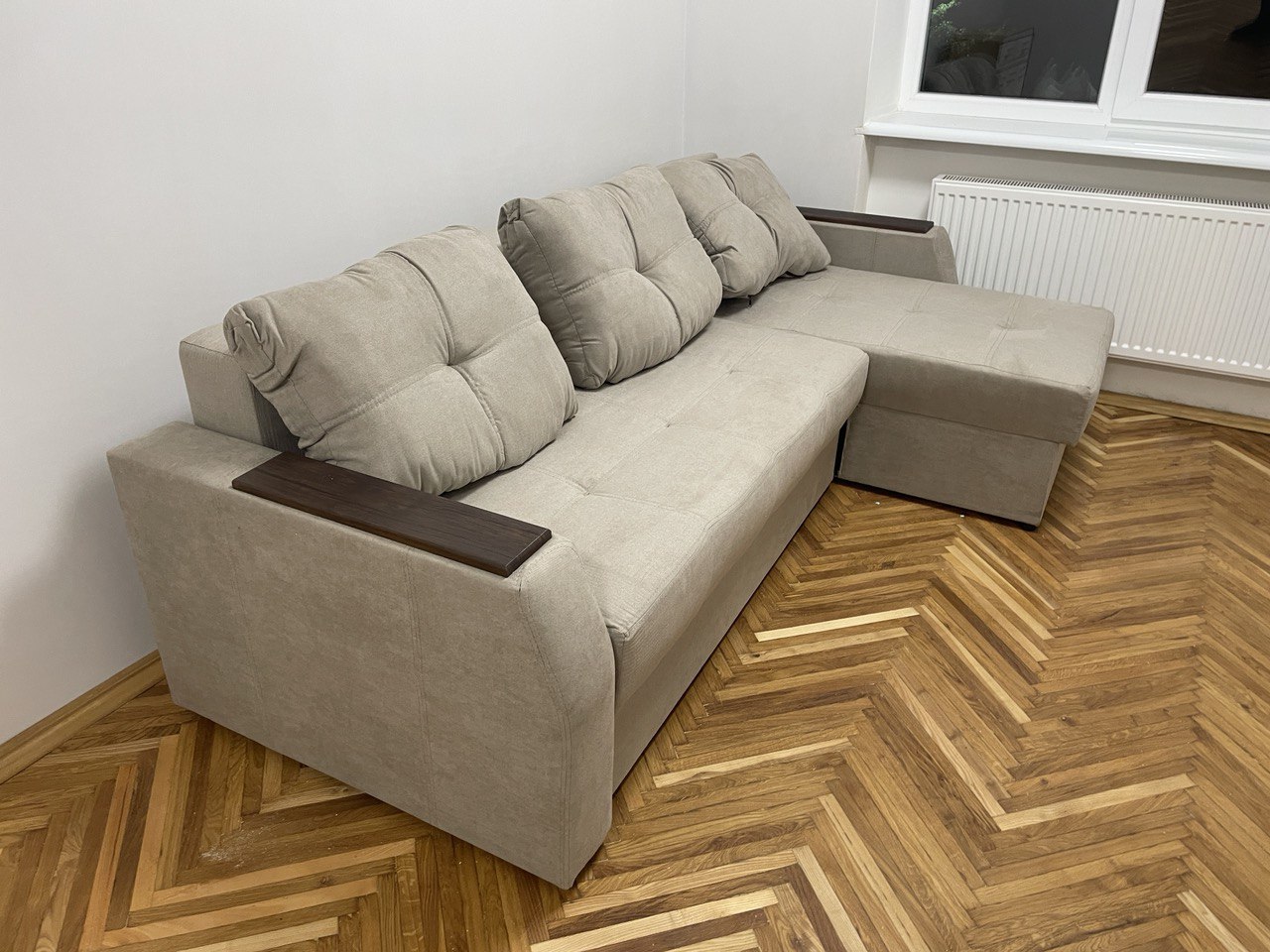 Цей проєкт ми робили для невеликої квартири в старому житловому фонді. Типова хрущовка, кімната близько 14 кв м, паркет “ялинкою”, стандартне вікно та радіатор під ним. Завдання було просте: організувати комфортне спальне місце, але без повноцінного ліжка…